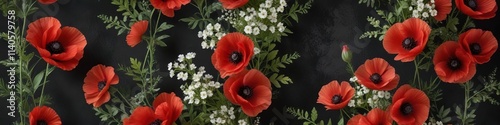 © สิริวุฒิ นาคโคตร, Obraz premium elegant bouquet of red poppies and white Spiraea on a dark, velvety black background with subtle texture, black background, red poppies