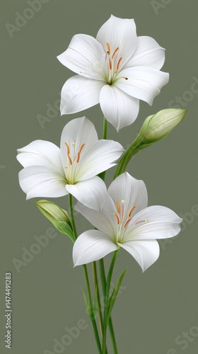 © MasTPX, Fototapeta premium Elegant bouquet showcasing three pristine white lilies in full bloom, complemented by delicate green buds and stems against a soft, muted olive green background.