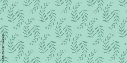 © Iry, Obraz premium Elegant branches with leaves on soft green background. Seamless foliage pattern. Nature motif print. Vector graphics