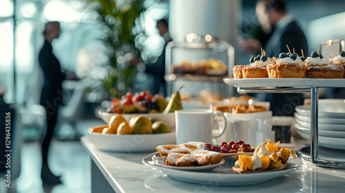 © ABF_MATEO, Naklejka premium Elegant breakfast buffet with pastries, fruit, and beverages creates a refined and inviting atmosphere for any morning gathering.