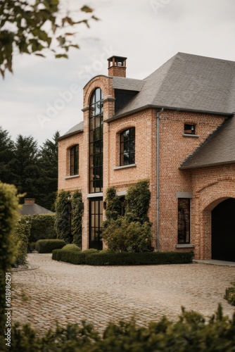 © gamespirit, Fototapeta premium Elegant brick house situated in a serene garden setting with well-maintained landscaping during overcast afternoon lighting