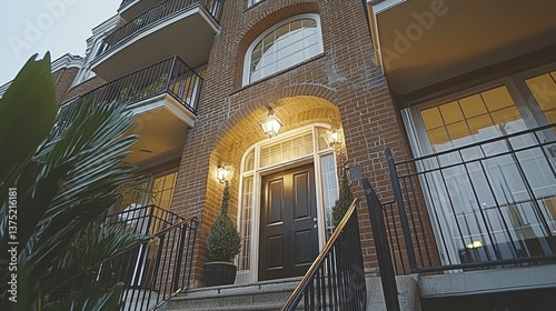 © novitasary, Obraz premium Elegant Brick Townhouse Entrance at Dusk