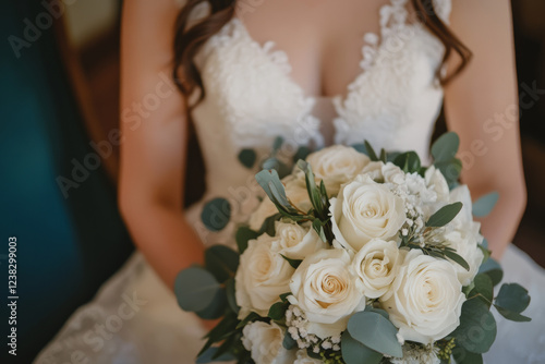 © MashMash, Naklejka premium Elegant bridal bouquet of white roses with greenery and bokeh lights in a romantic setting, perfect for wedding decor, celebrations, and floral design inspirations