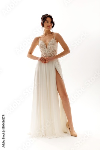 © Svetlana, Fototapeta premium Elegant bridal gown displayed by model in studio setting, emphasizing design details and fabric flow