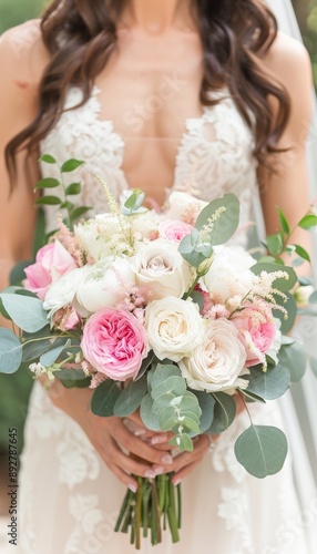 Naklejka premium Elegant Bride Holding Lush Bouquet of Pink and White Roses, Peonies, and Eucalyptus - Wedding Design