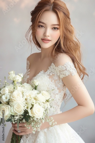 © ali, Naklejka premium Elegant Bride Holding White Rose Bouquet in Soft Pastel Wedding Dress Portrait