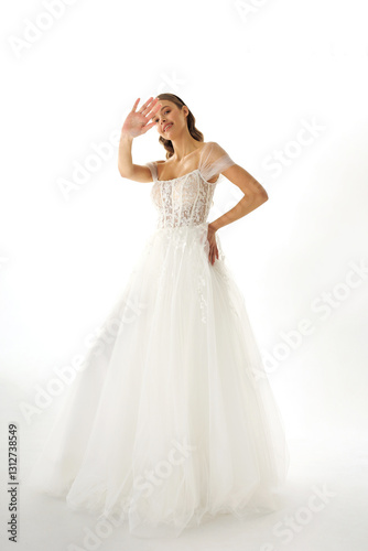 © Svetlana, Fototapeta premium Elegant bride in a flowing white gown posing gracefully against a light background during a bridal photoshoot