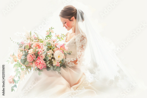 Naklejka premium Elegant Bride in Luxurious White Gown Painted in Watercolor Style, Graceful and Timeless Wedding Portrait Concept