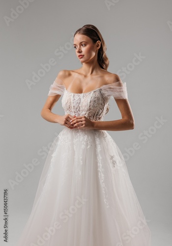 © Svetlana, Fototapeta premium Elegant bride in white dress poses gracefully against a neutral background during a modern fashion shoot