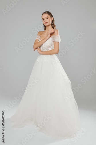 © Svetlana, Fototapeta premium Elegant bride posing in a romantic off-shoulder wedding gown with tulle skirt against a neutral background