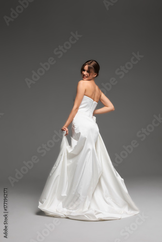 © Svetlana, Fototapeta premium Elegant bride showcasing a minimalist white wedding gown in a modern studio setting with soft natural light