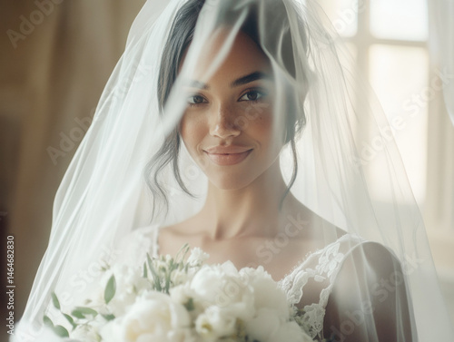 © CaptureCollabStudios, Naklejka premium Elegant bride with bouquet and veil in a soft-lit venue before ceremony