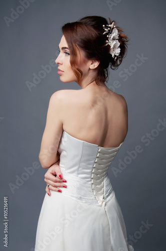 © different_nata, Fototapeta premium Elegant bride with short hair updo and bare shoulders dress