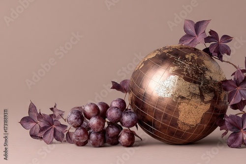 © João Queirós, Obraz premium Elegant Bronze Globe with Red Grapes and Autumnal Vines - Space for Text