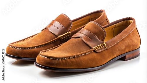 © kansak01, Fototapeta premium Elegant Brown Suede Loafers on White Background - Perfect for Fashion Shoots, Product Displays, and E-Commerce, Highlighting Style and Comfort in Footwear Photography