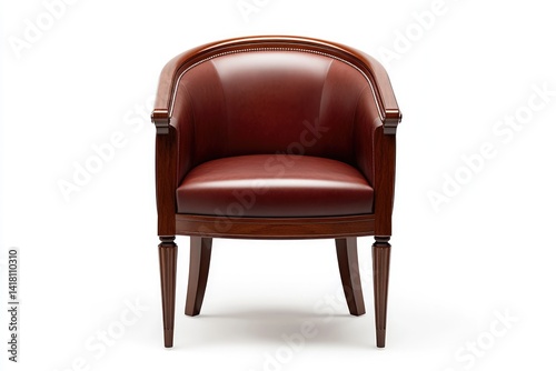 © Anjali, Naklejka premium Elegant burgundy leather armchair with dark wood frame, classic design.