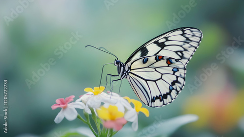 © Nhoeb, Naklejka premium Elegant butterfly perched on vibrant flowers in a serene garden setting