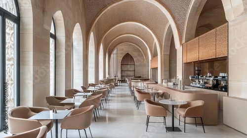 Naklejka premium Elegant cafe interior with arched ceilings and modern seating