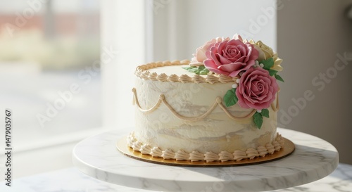 Fototapeta premium Elegant cake decorated with pink roses on a marble display stand in a bright,...