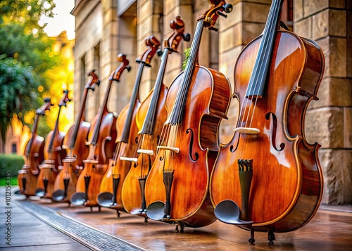 © Danicha, Naklejka premium Elegant cellos displayed in a serene setting showcasing craftsmanship and the beauty of music
