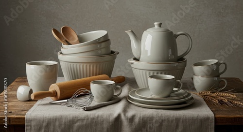 © Kraitong, Fototapeta premium Elegant Ceramic Dinnerware Display on Wooden Tabletop for Kitchen