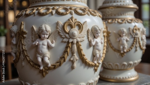 Fototapeta premium Elegant Ceramic Vases with Cherub Reliefs and Golden Accents, Decorative Home...