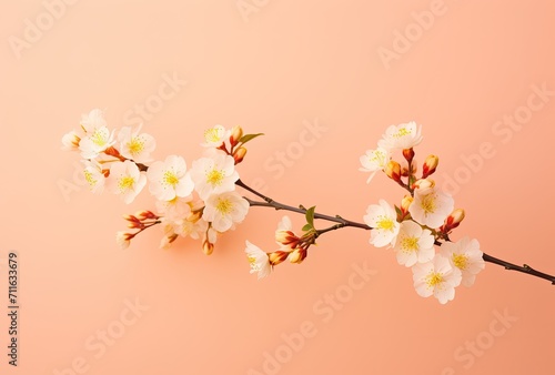 Fototapeta premium Elegant cherry blossom branch with flowers and buds against a soft pink backdrop