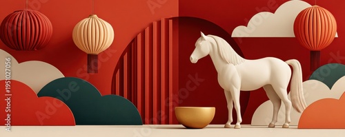 © Georgii, Fototapeta premium Elegant Chinese New Year horse scene with red lanterns and decorative clouds in 3D