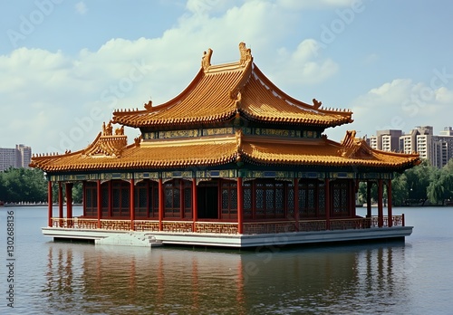 Fototapeta premium Elegant Chinese Pavilion Floats Serenely On Calm Lake Water