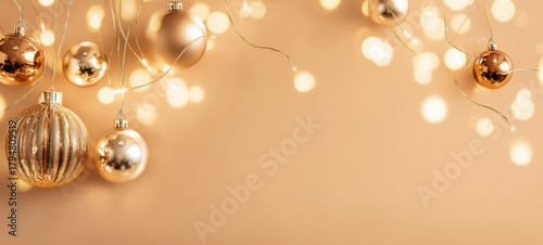 Obraz premium Elegant Christmas background with gold ornaments on warm light-gold and champagne backdrop, soft reflective lighting, high-resolution photography, premium quality, ample space for headline text, ultra