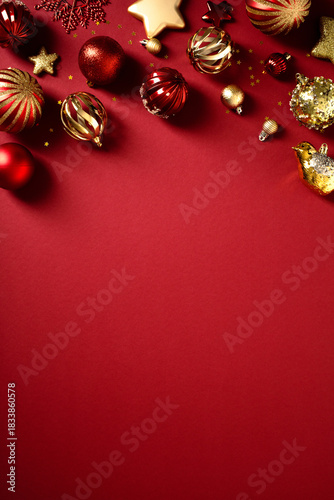© photoguns, Fototapeta premium Elegant Christmas border of golden and red holiday ornaments on a vertical red background.