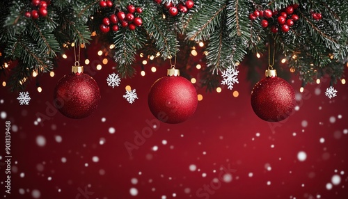 Fototapeta premium Elegant Christmas decorations hang from a tree against a vibrant red background
