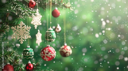 © Rafiqul, Naklejka premium Elegant Christmas Ornaments Hanging on Green Background with Snowflakes and Pine Branches