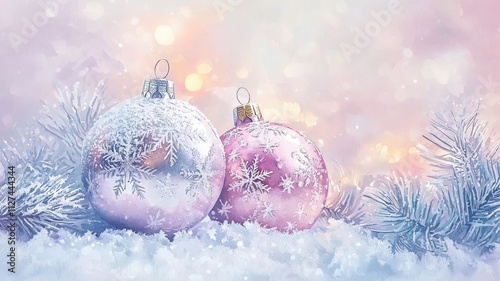 Fototapeta premium Elegant Christmas ornaments resting in a snowy background, creating a festive...