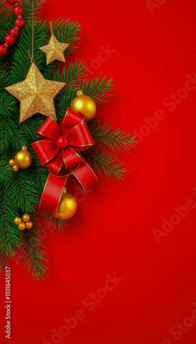 Obraz premium Elegant Christmas Tree Branch with Gold Ornaments and Red Bow