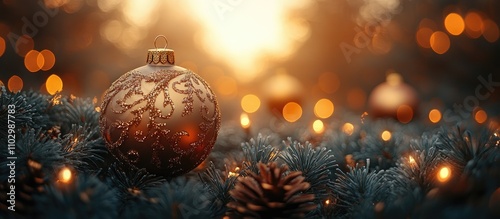 Fototapeta premium Elegant Christmas tree ornaments glistening in the warm glow of festive lights and pine branches during the holiday season