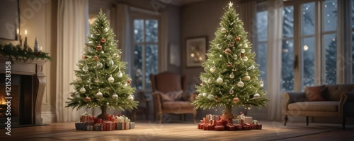 Fototapeta premium Elegant Christmas tree with frosted glass ornaments, frosty atmosphere, sparkling decorations, winter wonderland scene