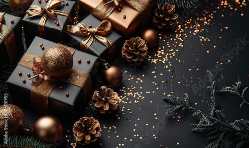 © Claudine, Fototapeta premium elegant christmas vertical composition,luxury gift box bronze balls,confetti on black background create a festive atmosphere modern for holiday cards posters,invitations