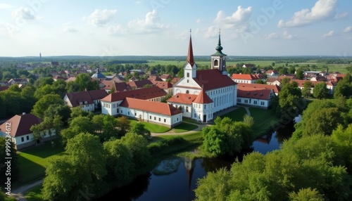 © SwathiFX, Fototapeta premium Elegant church nestled amidst lush greenery and tranquil waters