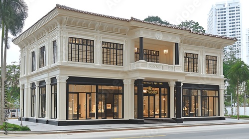 © shofi, Fototapeta premium Elegant, classic storefront building with large windows.