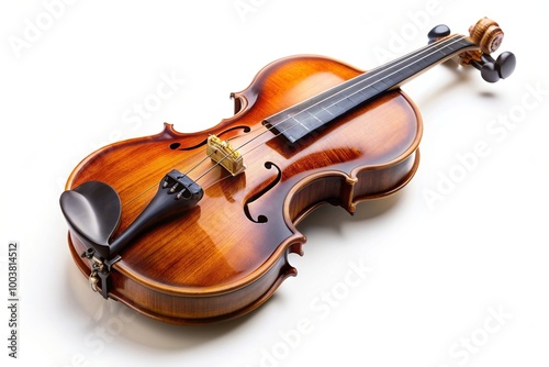 © Latsamee, Fototapeta premium Elegant classical violin made of fine craftsmanship showcasing detailed wood grain on a white background at eye level, instrument, excellence, fine craftsmanship, white background
