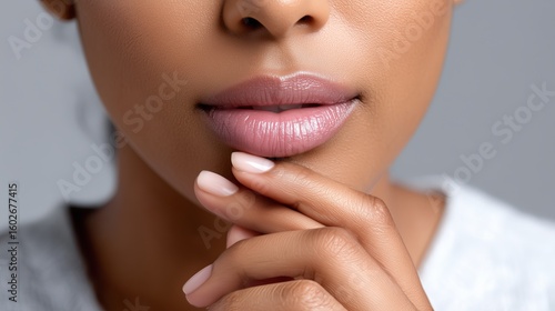 Fototapeta premium Elegant close-up of a woman's lips and hands highlighting beauty and grace