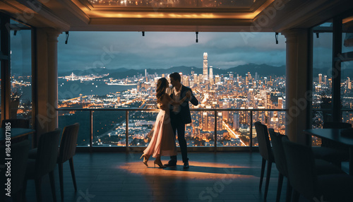 Fototapeta premium Elegant couple dancing intimately on a luxurious highrise balcony,...
