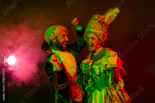 © deagreez, Fototapeta premium Elegant Couple Dressed in Historical Noble Costumes Dancing Joyfully at a Vibrant Club Scene with Colorful Lighting