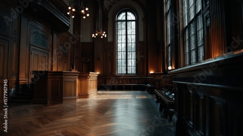 Fototapeta premium Elegant courtroom with towering windows and polished wood elements inviting...
