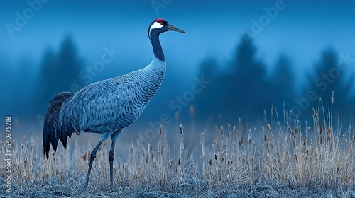 © Jennifer, Naklejka premium Elegant crane in a frosted field at dawn.