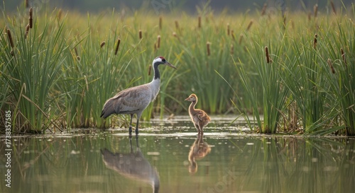 © Dede, Naklejka premium Elegant crane standing in wetland, symbol of grace and longevity, perfect for wildlife, nature, and bird photography themes.