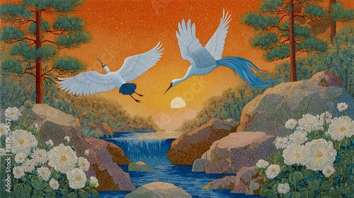 © faysal, Naklejka premium Elegant Cranes Fly Over Serene Waterfall Landscape Painting at Sunset
