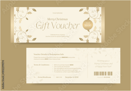 © BrandPacks, Naklejka premium Elegant Cream and Gold Christmas Gift Voucher Template with Holly Leaves and $100 Value Tag