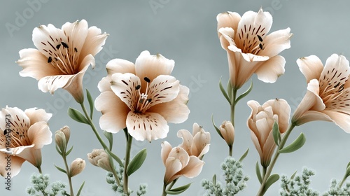 Fototapeta premium Elegant Cream-Colored Flowers with Delicate Petals and Green Leaves Against a...